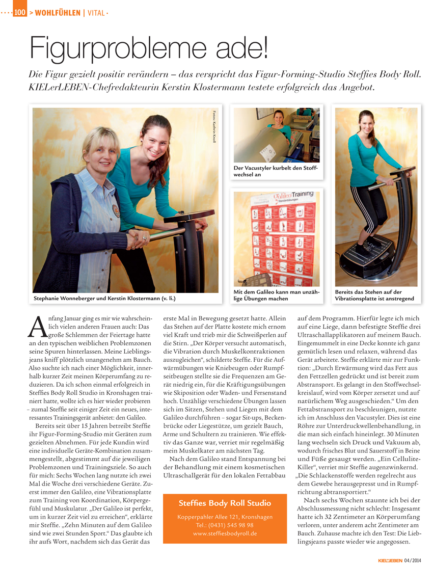 „Vor einem Jahr besuchte ich das erste Mal Steffies Body Roll Studio – ursprünglich, um für vier Wochen die Geräte zum gezielten Abnehmen für KIElerLEBEN zu testen. Der Erfolg war großartig: Ich konnte mich über insgesamt 22 Zentimeter weniger Umfang an Oberschenkeln, Hüfte, Taille und Bauch freuen. Zu verdanken hatte ich das in erster Linie der Rollen-Impuls-Massage (RIM), bei der die einzelnen Körperpartien von rotierenden Holzrollen ,bearbeitet‘ werden. Die Rollen geben Druck ab, durch den der Stoffwechsel und die Fettverbrennung angeregt werden. Unterstützend benutzte ich außerdem den Vacustyler – eine Röhre, die Unterdruck erzeugt und so die Durchblutung und die Fettverbrennung fördert. Das Ergebnis überzeugte mich so, dass ich auch über die vierwöchige Testzeit hinaus am Ball blieb. Und noch heute dabei bin! Ich habe vier Kilogramm abgenommen, und mein ,Hüftgold‘ ist deutlich geschrumpft … Aber nicht nur der sichtbare Erfolg begeistert mich an Steffies Body Roll Studio, auch die familiäre Atmosphäre gefällt mir. Es gibt Kaffee, Tee und immer einen netten Klönschnack mit Inhaberin Steffie. Ohne Hungerkur oder Sport ganz entspannt abnehmen – es geht wirklich!“ (Kerstin Klostermann, Redakteurin KIELerLEBEN)